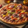 sauce barbecue, mozzarella, viande hachée, poivrons, oignons