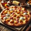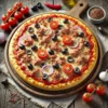 tomate, mozzarella, jambon*, chorizo*, lardons*