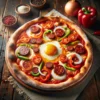tomate, mozzarella, merguez, œuf, poivrons, oignons