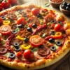 tomate, mozzarella, olives, viande hachée, oignons, piments verts