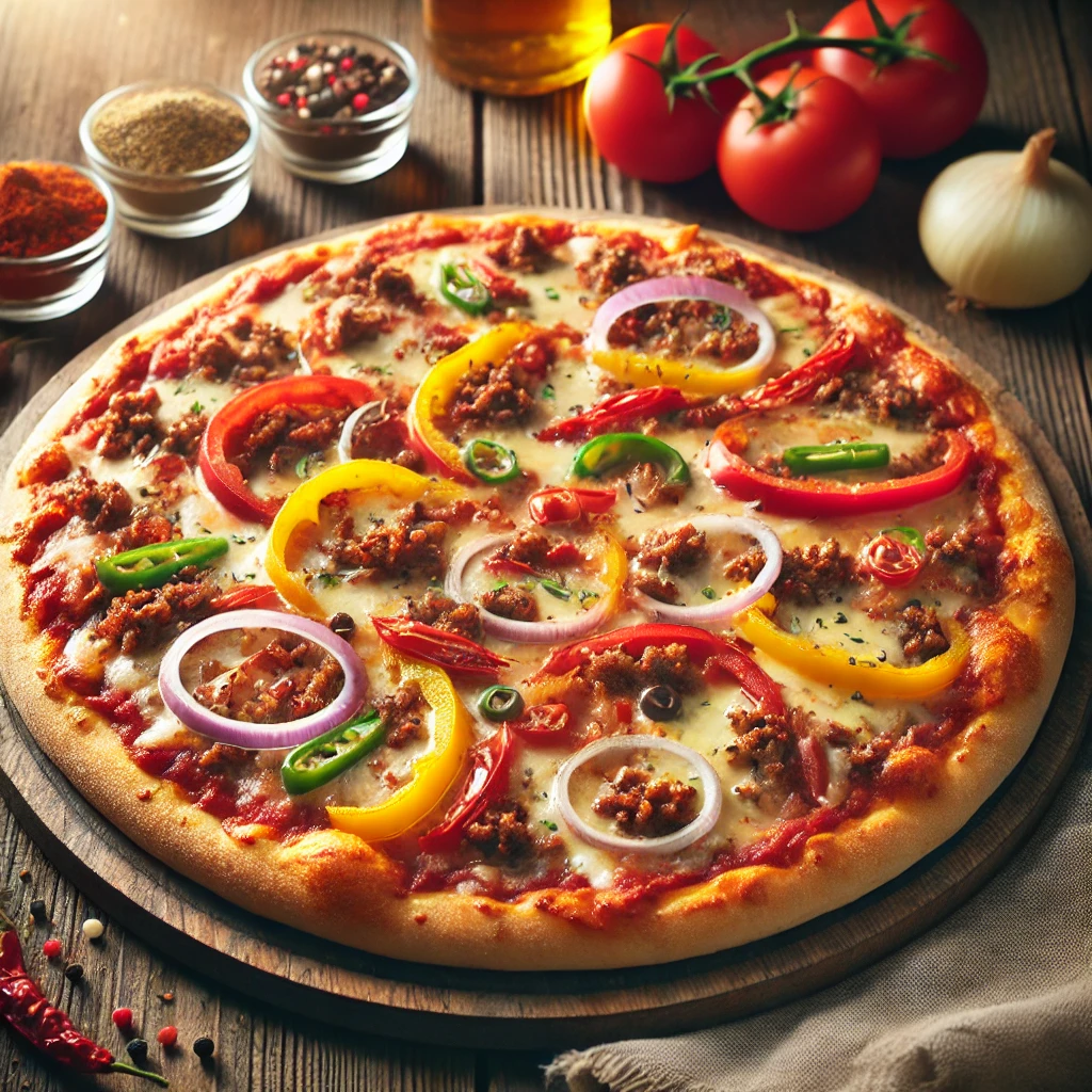 tomate, mozzarella, viande hachée, oignons, chèvre